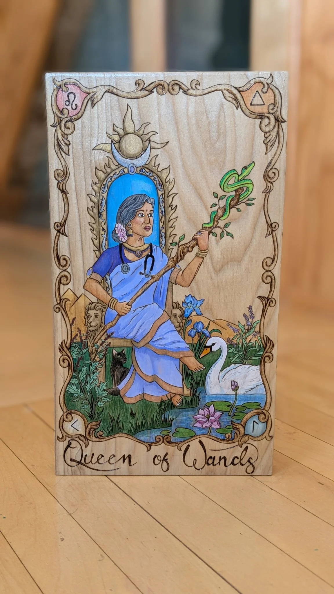 Once I had her in mind, the rest of the pieces of the composition fell naturally together. I added the snake onto the wand to represent the rod of Asclepius (the Greek symbol for healing associated with medicine), and used imagery inspired by the goddess Saraswati, the Hindu goddess of the arts and poetry, learning, and language. She, too, is a beautiful representation of the passions and myriad paths that one can walk toward our highest selves. The swan at her feet is her vehicle and is associated with the discernment of the spirit to understand right and wrong. The lotus that grows from the mud is another symbol of the knowledge one can have when one is connected to the spiritual self. The other plants at her feet are mugwort (for intuition), sage (for wisdom), and blue iris (connected to the goddess Iris, who bridged the heavens and earth). While the Queen of Wands has connections to all fire signs (with the alchemical fire symbol at the top right), the Leo fire sign is a strong association, especially as she sits on her throne of lions that look in each direction. I chose the kenaz rune (bottom left) to show the illumination that comes from knowledge and study and the laguz rune (bottom right), which brings in the water and intuition elements of the Queen of Wands. The runic poems of laguz show the varied nature of water and intuition. In one, we read about the ornaments of gold (Which I interpret as the rewards of listening to one's inner wisdom), in another, we read of the dangers of the water. Walking in our own power and embracing all that we are is a continuous balance of these different aspects of self as we gather knowledge, wisdom, and heed our own intuition.